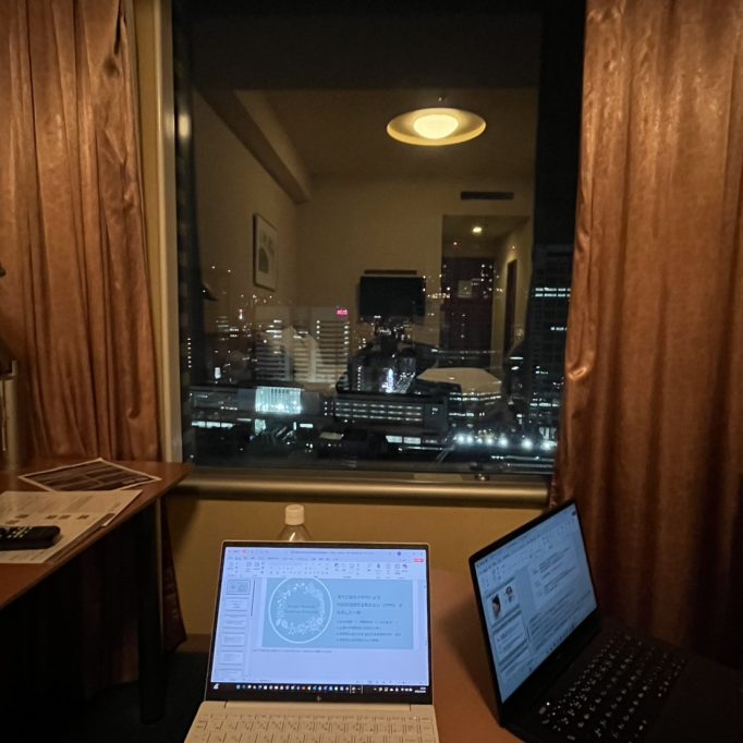 ツムラさんが前泊におさえてくれた品川プリンスホテルの夜景が地面師での山本耕史を彷彿とさせる都内の一望っぷりでした。そんな夜景を見ながら先輩鍼灸師と最後のスライドチェックをしました。